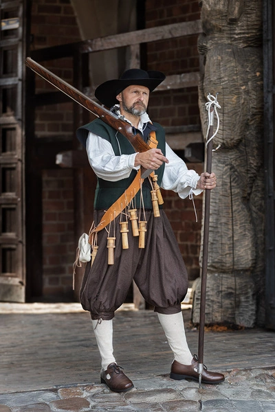 A leather belt-bandolier with 12 wooden apostles (powder containers). Used in the 16th and 17th centuries by soldiers firing matchlock muskets. The belt has a brass buckle and a leather bullet pouch.