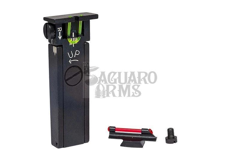 Szczerbinka regulowana i muszka światłowodowa. Dedykowana do montaży na karabinach Kodiak Express w miejsce tradycyjnych przyrządów. Muszka montowana na jaskółczy ogon 9,5mm , szczerbinka na śrubę zawartą w komplecie.Doskonała jakość. Produkcja Pedersoli.