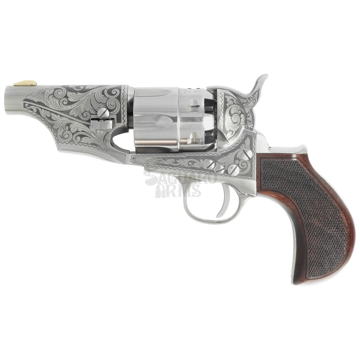 Sześciostrzałowy grawerowany rewolwer ze stali utwardzanej polerowanej. z rękojeścią typu birdshead. Rama hartowana ogniowo , rękojeść z drewna orzechowego - moletowana. Przyrządy celownicze - muszka stała , szczerbinka w kurku. Bębenek kanelowany.