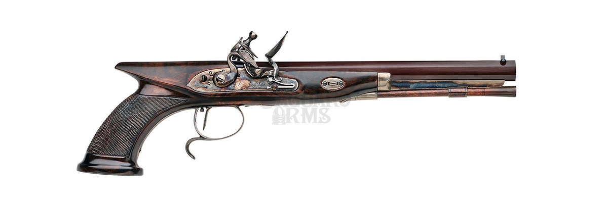 Pistolet czarnoprochowy Tatham&Egg . Replika z zapłonem skałkowym w kalibrze .45 o lufie gładkiej , przystosowana do strzelania konkurencji sportowej Cominazzo według przepisów MLAIC . Kod S.372 . Piękne ekskluzywne drewno ( klon pasiasty)